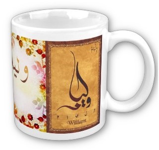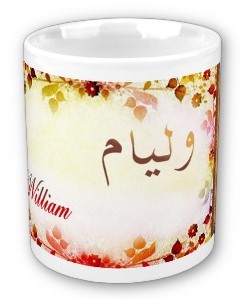 Mug avec le prénom "William" calligraphié en arabe (وليام) ainsi que son épellation lettre par lettre en arabe.
