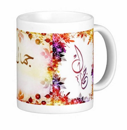 Mug avec le prénom "Jamel" écrit en français, en arabe (جمال) et calligraphié de façon artistique en arabe sur la partie droite.