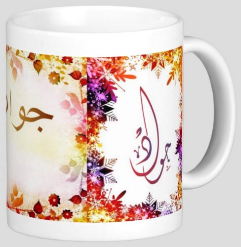 Mug avec le prénom "Jawad" écrit en français, en arabe (جواد) et calligraphié de façon artistique en arabe sur la partie droite.