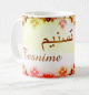Mug avec le prénom "Nehla" écrit en français, en arabe (نهلى) et calligraphié de façon artistique en arabe sur la partie droite.