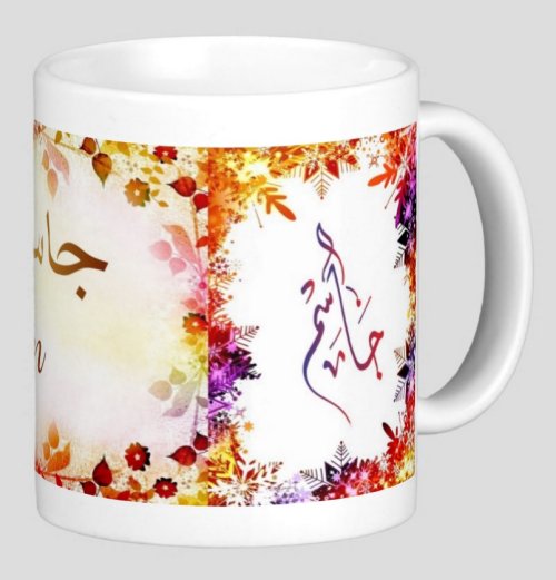 Mug avec le prénom "Jassim" écrit en français, en arabe (جاسم) et calligraphié de façon artistique en arabe sur la partie droite.