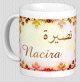 Mug avec le prénom "Zouhour" écrit en français, en arabe (زهور) et calligraphié de façon artistique en arabe sur la partie droite.