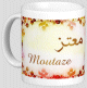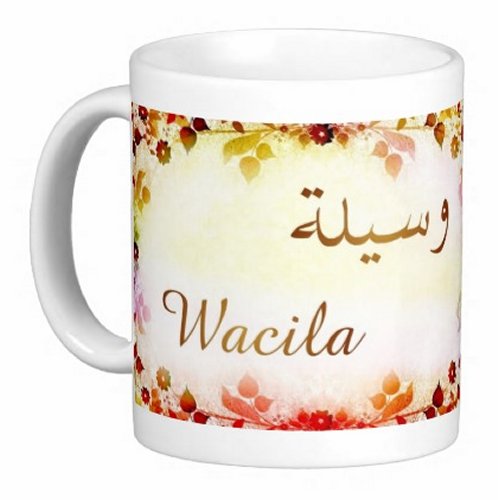 Mug avec le prénom "Wacila" écrit en français, en arabe (وسيلة) et calligraphié de façon artistique en arabe sur la partie droite.