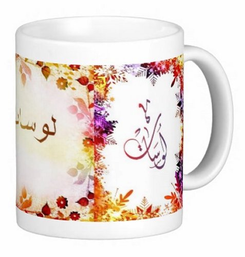 Mug avec le prénom "Lucette" écrit en français, en arabe (لوسات) et calligraphié de façon artistique en arabe sur la partie droite.