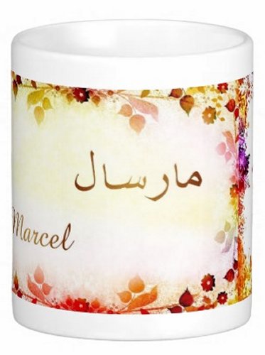 Mug avec le prénom "Marcel" écrit en français, en arabe (مارسال) et calligraphié de façon artistique en arabe sur la partie droite.