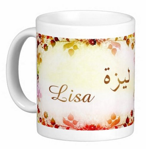 Mug avec le prénom "Lisa" écrit en français, en arabe (ليزة) et calligraphié de façon artistique en arabe sur la partie droite.