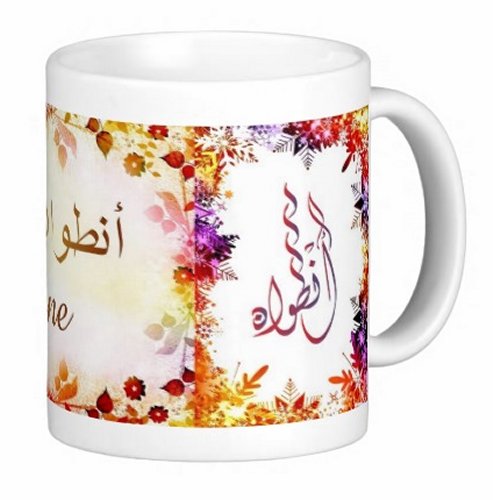 Mug avec le prénom "Antoine" écrit en français, en arabe (أنطوان) et calligraphié de façon artistique en arabe sur la partie droite.