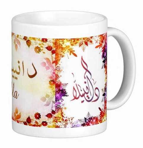 Mug avec le prénom "Daniella" écrit en français, en arabe (دانييلا) et calligraphié de façon artistique en arabe sur la partie droite.