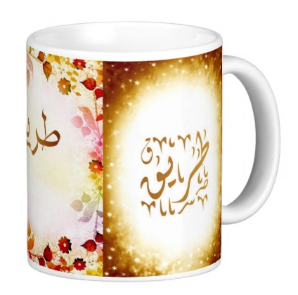 Mug avec le prénom "Tarik" écrit en français, en arabe (طريق) et calligraphié de façon artistique en arabe sur la partie droite.