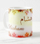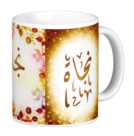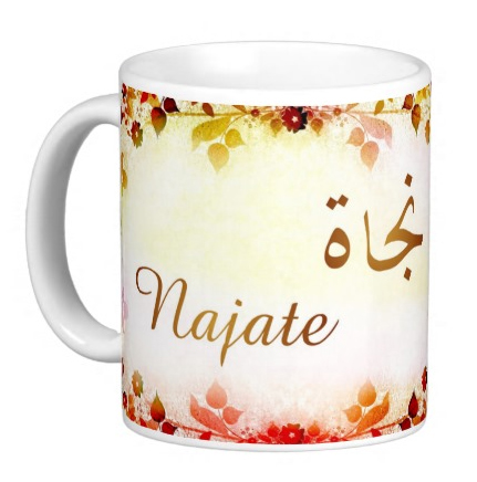 Mug avec le prénom "Najate" écrit en français, en arabe (نجاة) et calligraphié de façon artistique en arabe sur la partie droite.