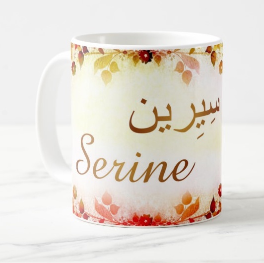 Mug avec le prénom "Serine" écrit en français, en arabe (سيرين) et calligraphié de façon artistique en arabe sur la partie droite.