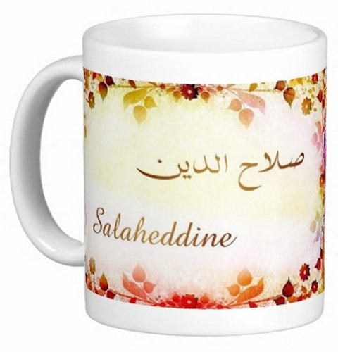 Pack constitué du Parfum (3 ml) "Salaheddine" et du Mug avec le prénom "Salaheddine" écrit en français, en arabe (صلاح الدين) et calligraphié de façon artistique en arabe sur la partie droite.