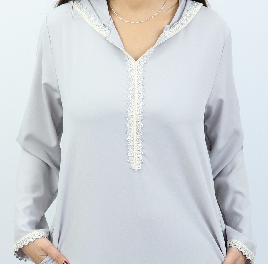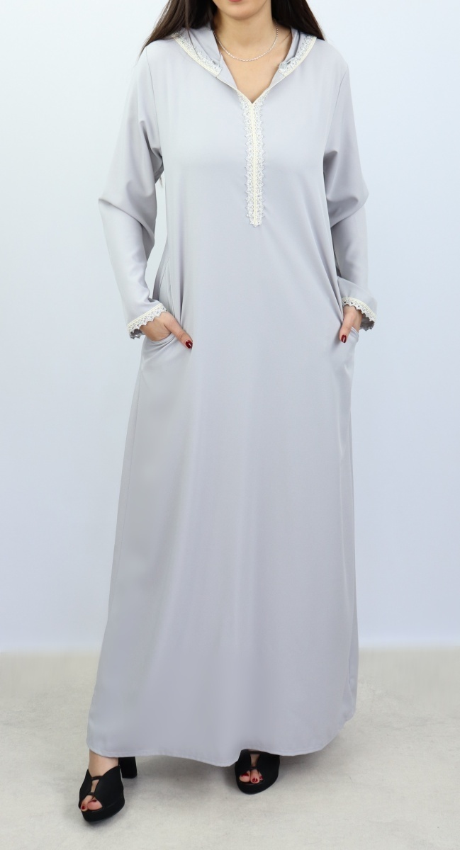Djellaba marocaine avec dentelles dorées sur le devant, sur les poignets ainsi que le contour de la capuche, 2 poches latérales pratiques pour ranger vos effets personnels.
