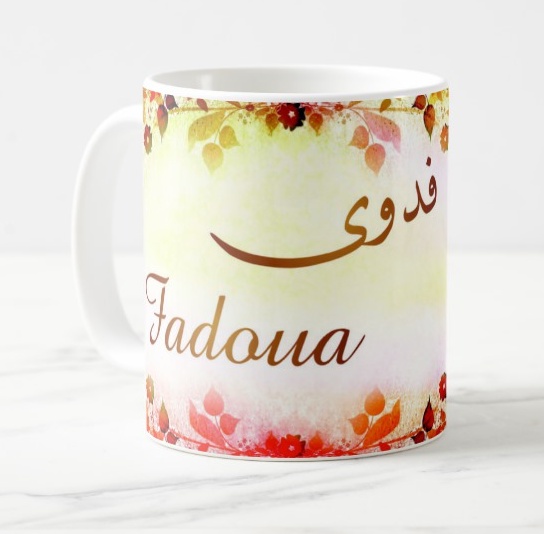 Mug avec le prénom Fadoua calligraphié en arabe ainsi que son écriture normale en arabe (فدوى) et en français.
