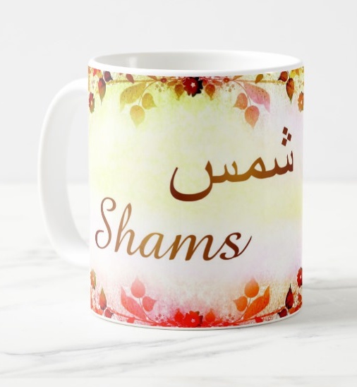 Mug avec le prénom Shams calligraphié en arabe ainsi que son écriture normale en arabe (شمس) et en français.