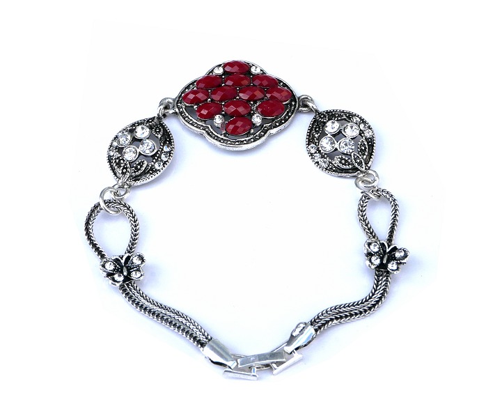 Bracelet artisanal marocain avec des pierres de couleur bordeaux.