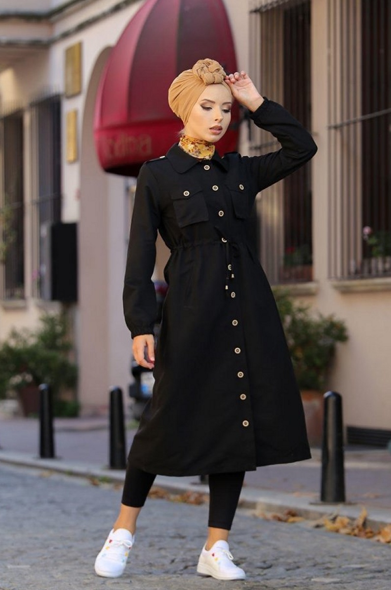 Trench-coat et Robe mi longue, manches longues finition élastiques aux poignets, col chemise, deux poches plaquées + 2 poches latérales, cordon de serrage, fermeture boutons sur toute la longueur.