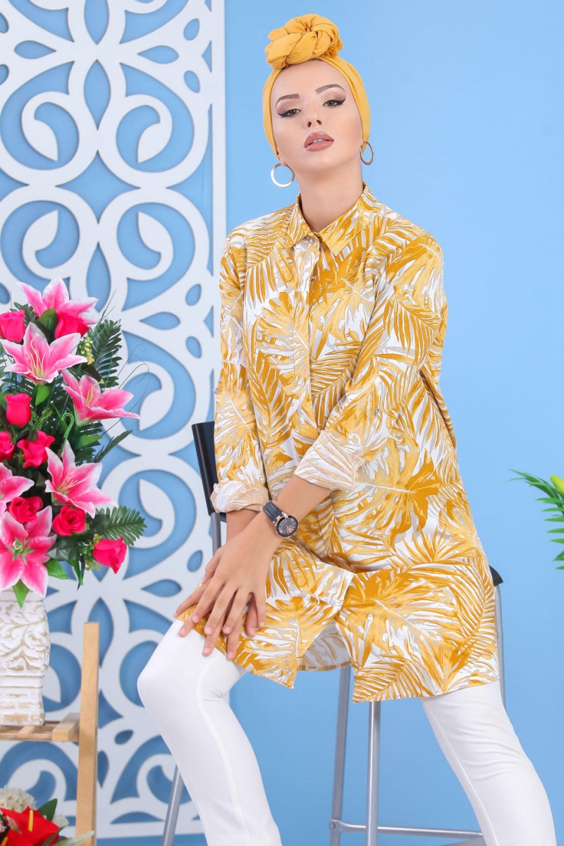 Chemise longue, col chemise, manches finition boutons aux poignets, coupe légèrement évasée, extrémités arrondies. Ce modèle à imprimés "tropical", très tendance, vous permettra de sortir du commun. Vous pourrez le porter aussi bien en journée qu'en soirée.