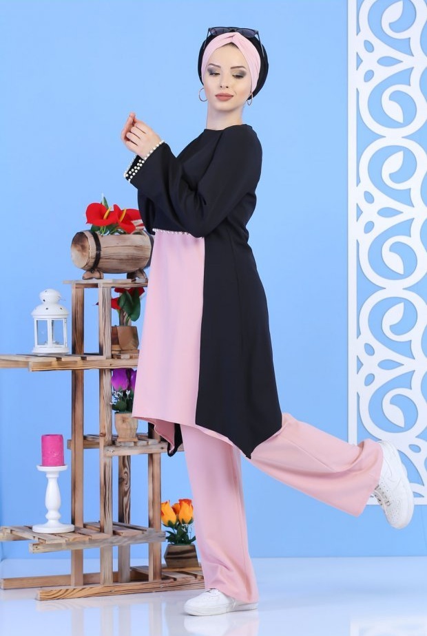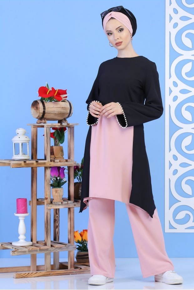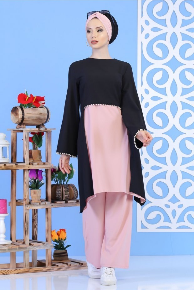 Ensemble 2 pièces : tunique longue, col arrondi, fermeture zippée au dos, manches légèrement évasées et perlées ainsi qu'au niveau de la taille ; Pantalon taille élastique, coupe ample.