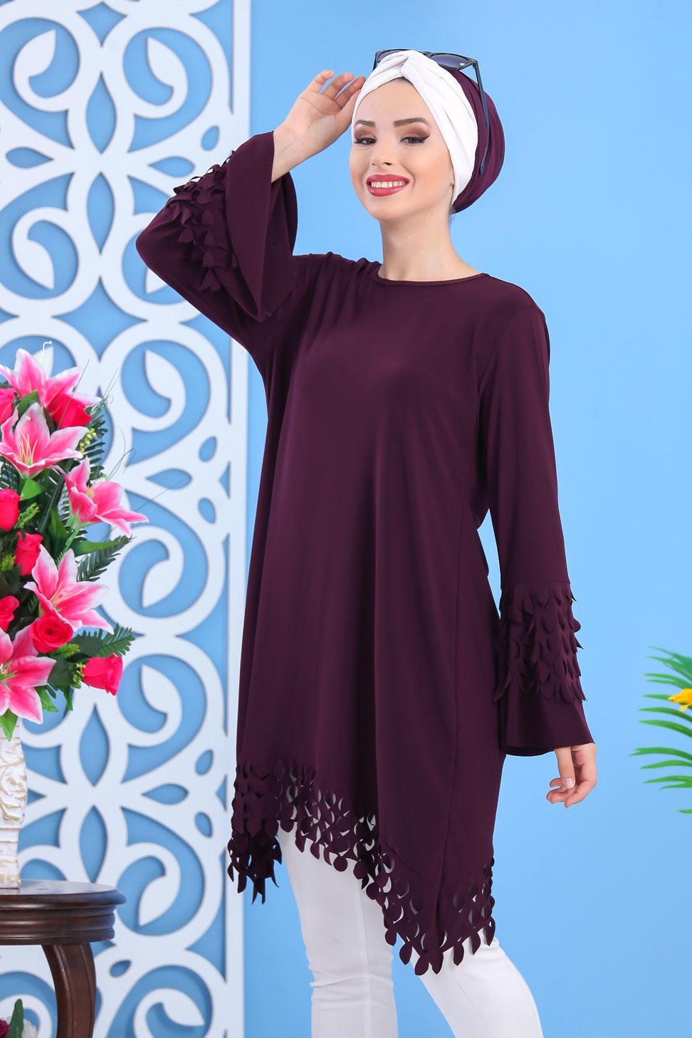 Tunique longue, col rond, manches évasées, coupe ample. Avec son effet plume sur les manches et le bas cette tunique vous plaira pour son originalité.