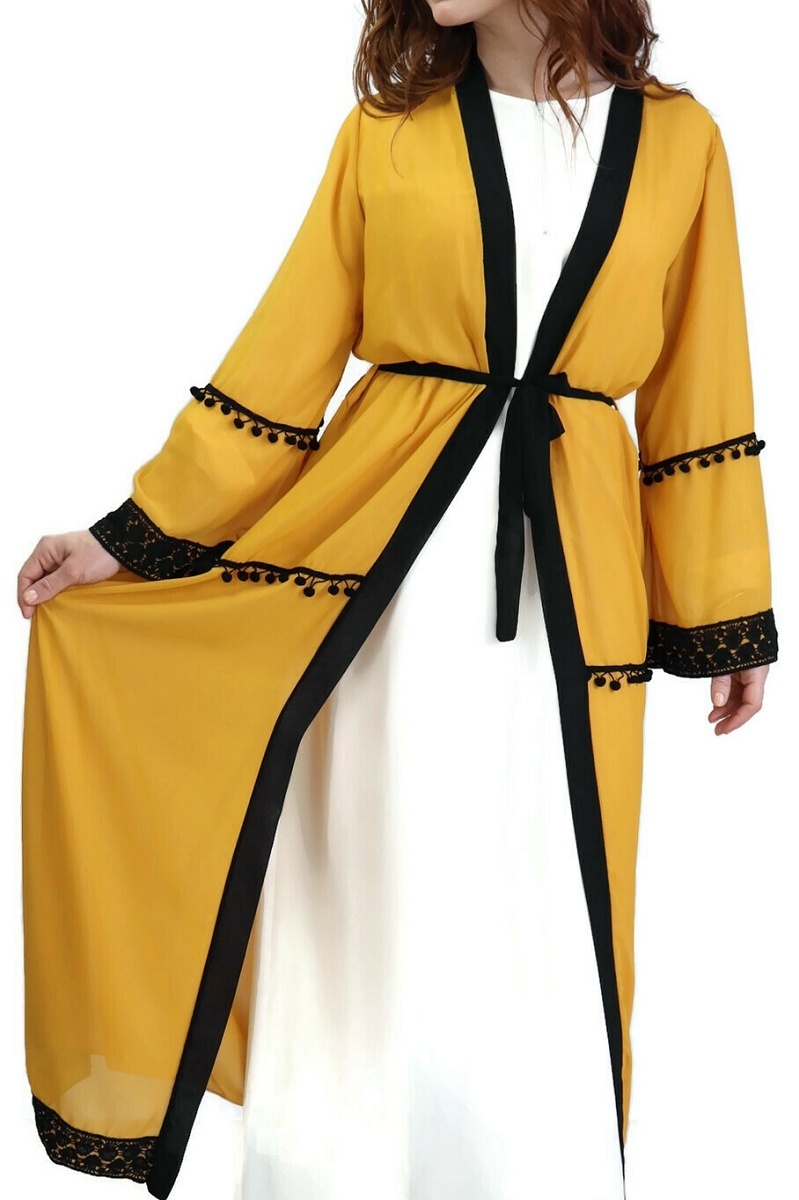 Simple et utile, il se porte ouvert ou fermé et on peut l'ajuster à la taille ou non selon les circonstances. Ses manches sont légèrement évasées, elles sont ornées de pompons qui feront sensation, alors saisissez l'occasion en vous offrant ce beau cardigan.