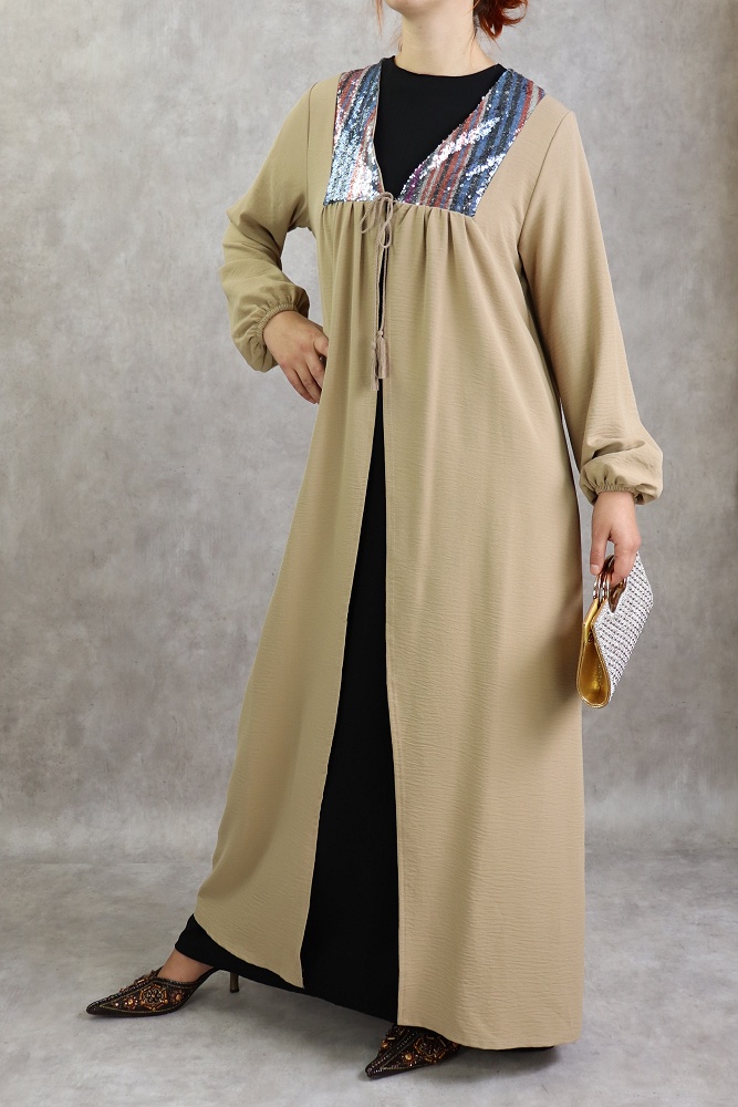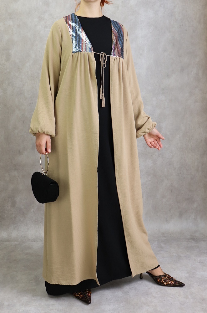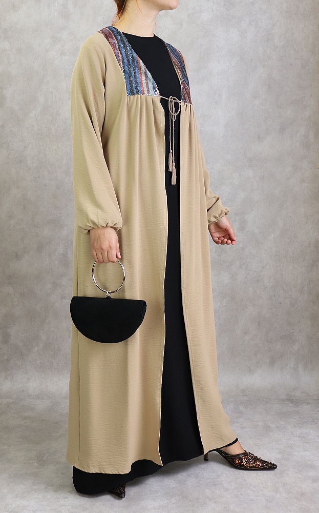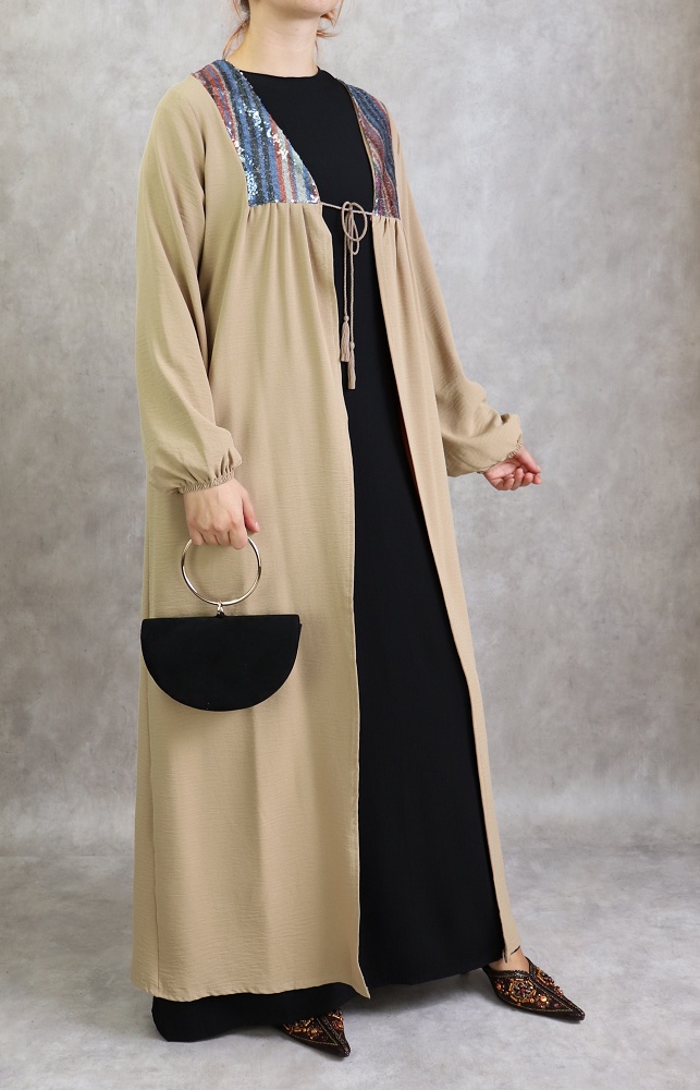 Kimono long, manches finition élastique, liens d'attache et strass colorés au niveau de la poitrine, tissu fluide et opaque.