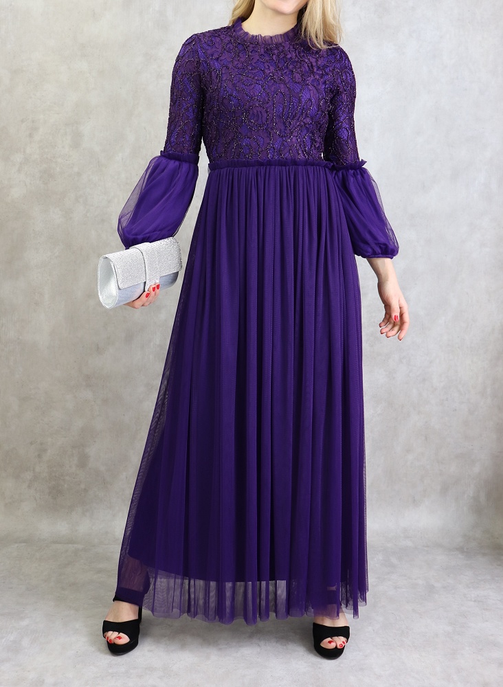 Robe longue, col rond orné d'une collerette, manches finition élastique aux poignets, fermeture à glissière dans le dos, entièrement doublée, broderies sur le buste et une partie des manches, tulle sur tout le reste de la robe.
