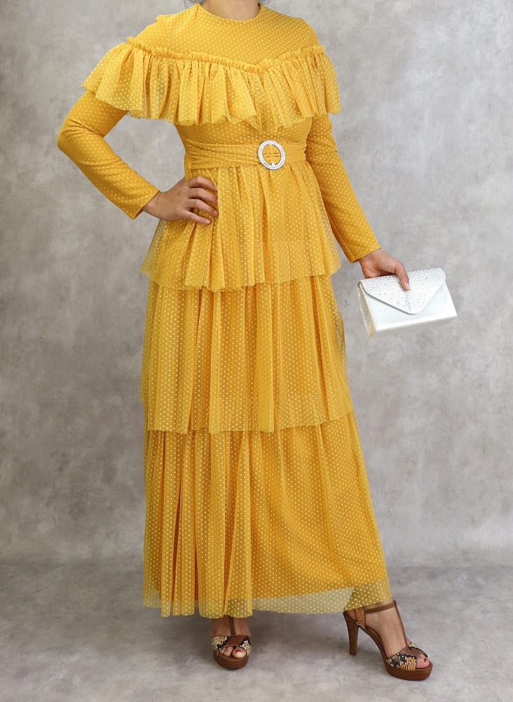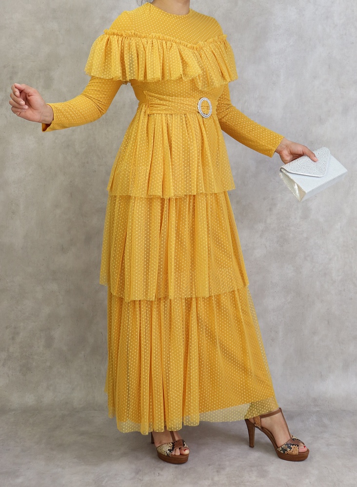 Robe longue, col rond, taille élastique, ceinture d'ornement en strass, fermeture glissière au dos, entièrement doublée, tissu extérieur effet tulle avec volants.