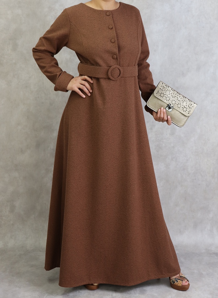Robe longue, col rond, fermeture boutons sur le devant, manches finition revers, taille cintrée, ceinture réglable, assortie à passants, tissu doux et épais, effet lainage, coupe évasée vers le bas.