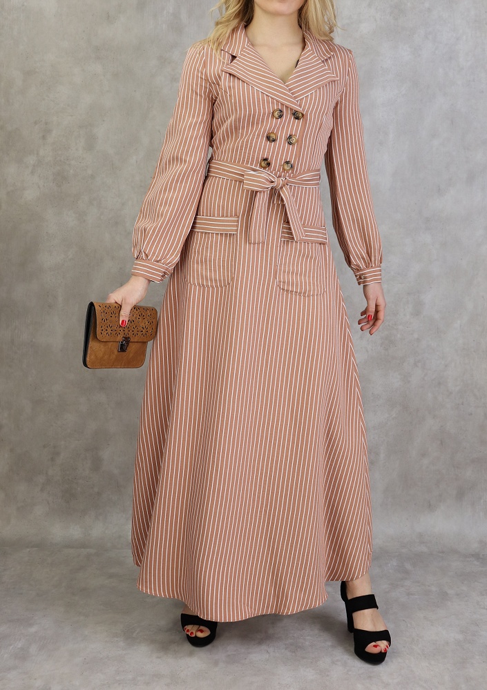 Cette robe rivalise d'élégance et d'originalité avec son double boutonnage et son imprimé à rayures, à vous de l'adopter.