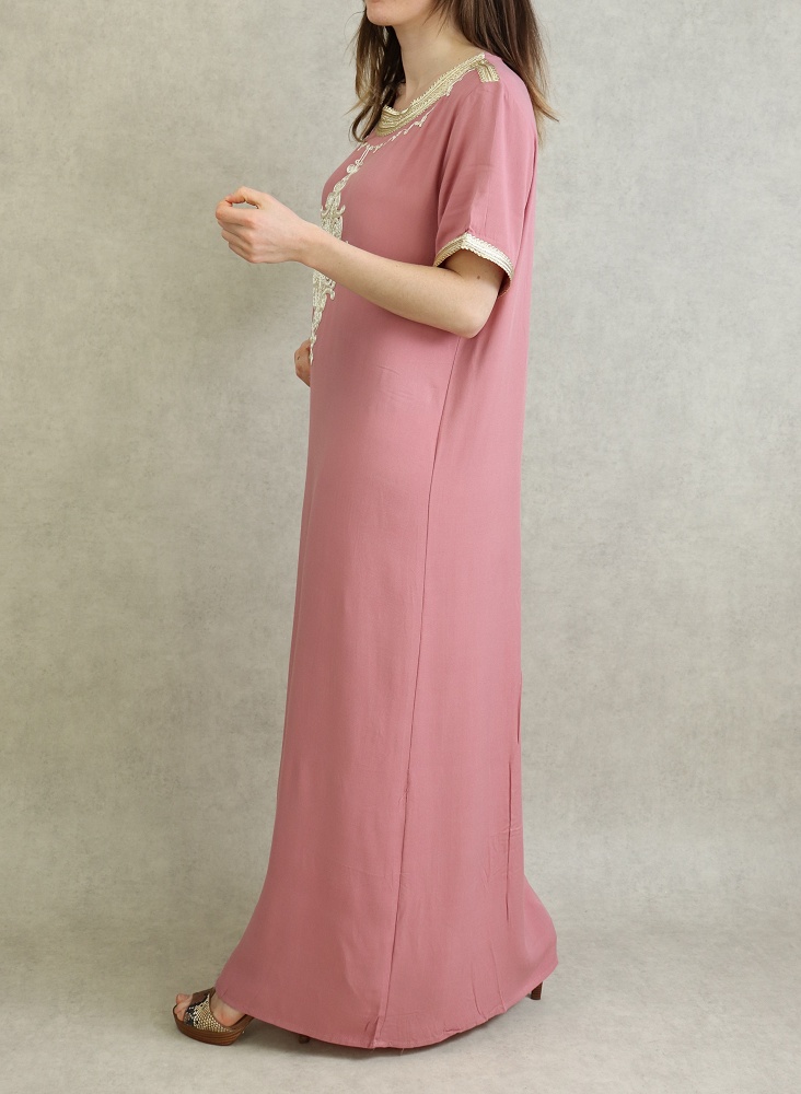 Une robe longue très confortable, manches courtes. Coupe droite avec nombreuses broderies. Matière fluide et agréable de type coton.