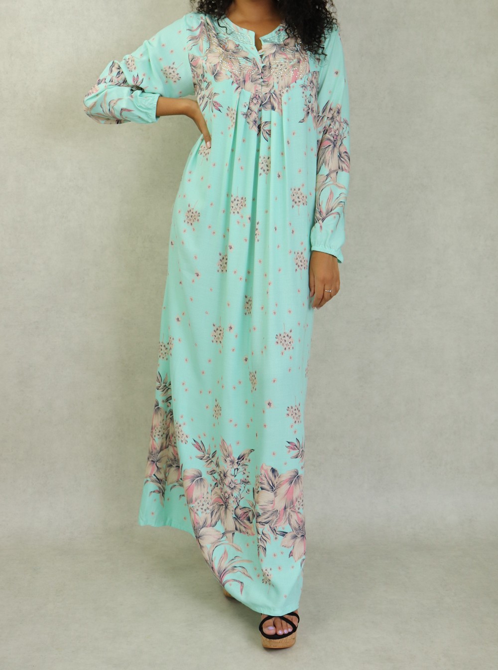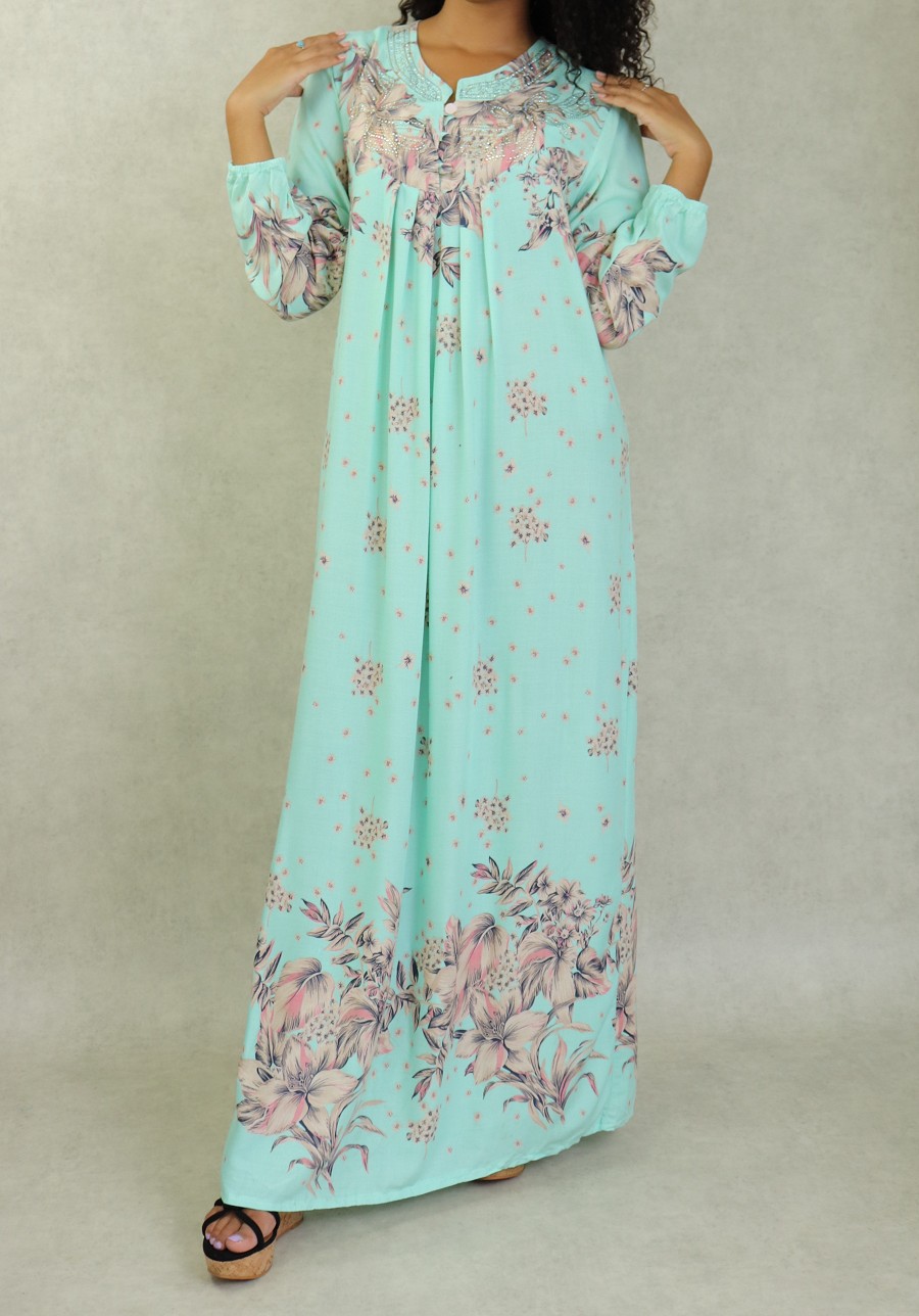Robe d’intérieur avec motifs à fleurs sur fond Vert d'eau. Col rond avec quelques strass et trois boutons décoratifs sur l'avant, manches longues finition élastiques aux poignets, matière