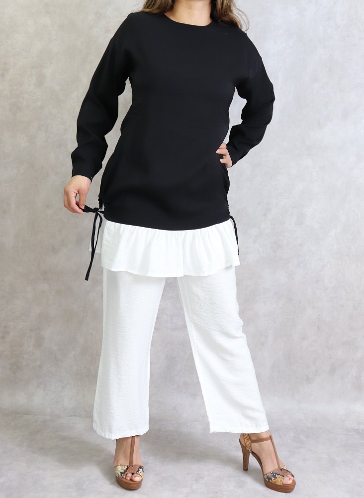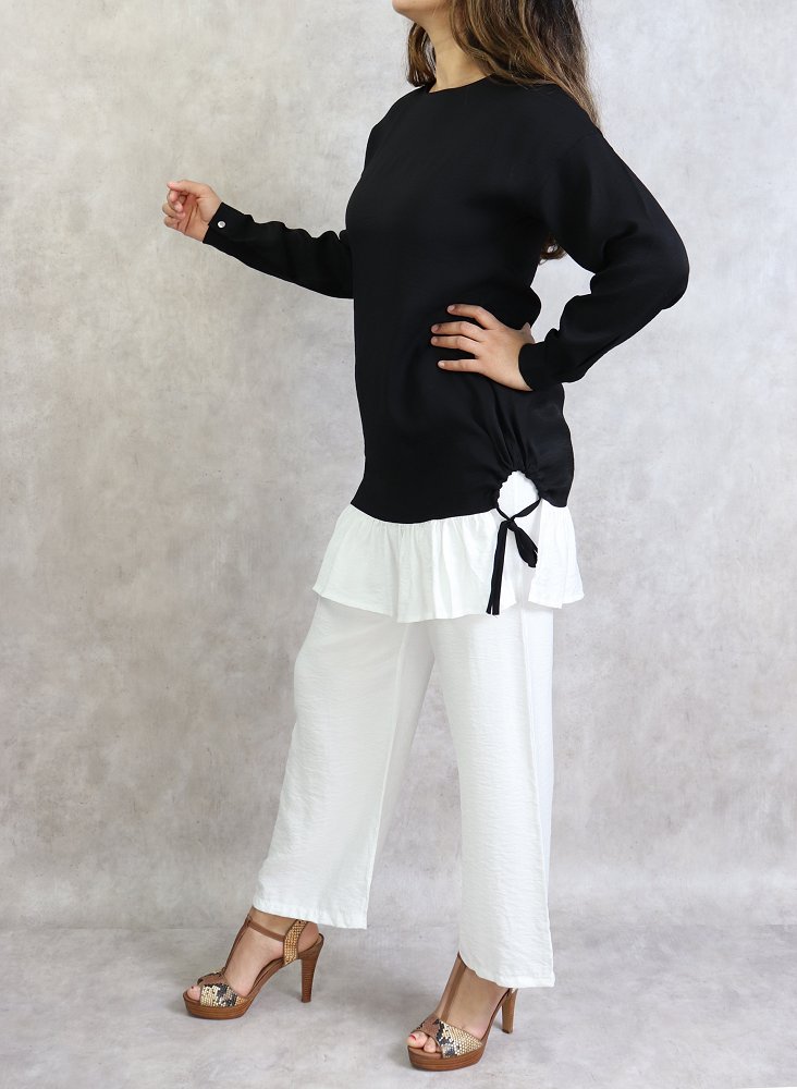 Tunique bicolore à volants, avec deux lien à attacher sur les cotés, coupe évasée, manches longues finition boutons.