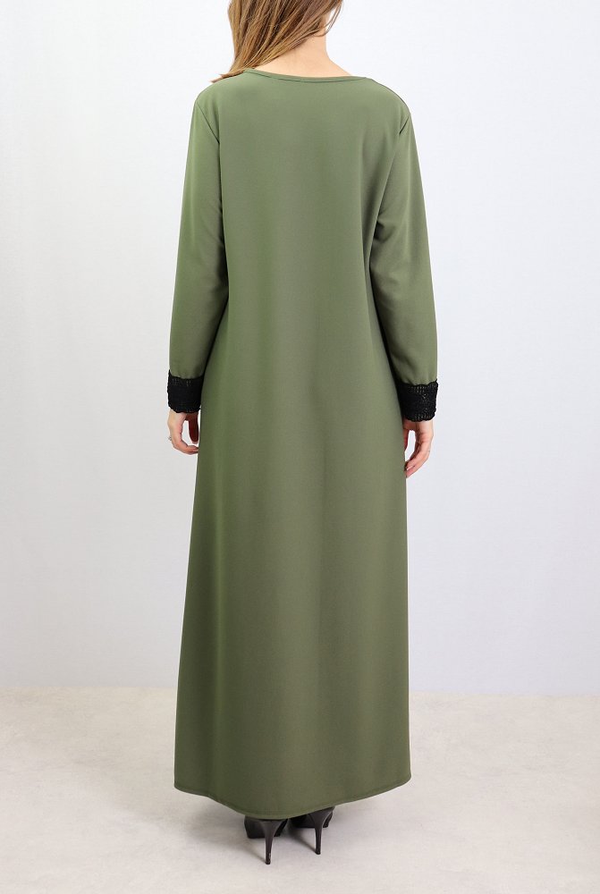 Belle robe sobre et discrète ornée de broderies sur les épaules et les poignets, col rond, poches latérales très pratiques, tissu opaque et léger.