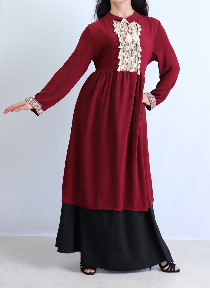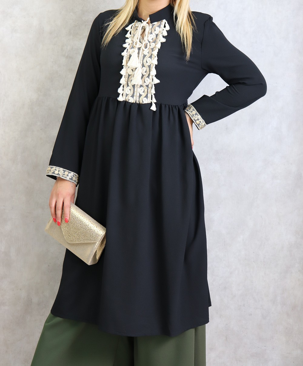 Tunique à pompons brodée et décorée, col rond doté de cordons, ceinture à 2 liens qui peuvent aussi bien se nouer à l’avant comme à l'arrière afin de faire un effet cintré. Matière de type crêpe légère et agréable à porter.