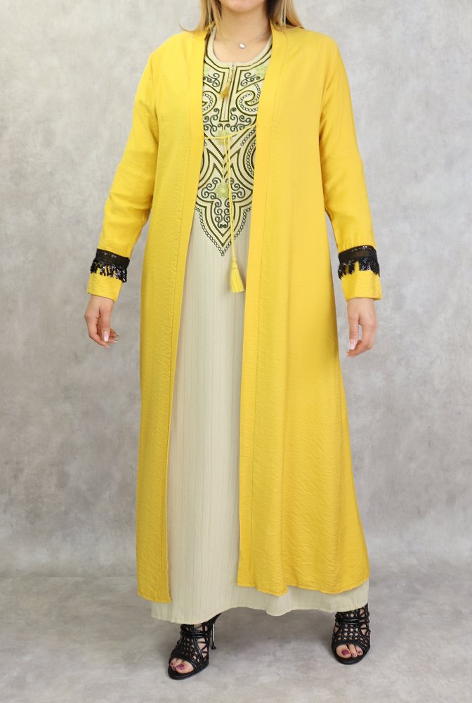 Kimono long, fermeture par cordons à pompons, ornements franges à strass sur le bas des manches, tissu non transparent.