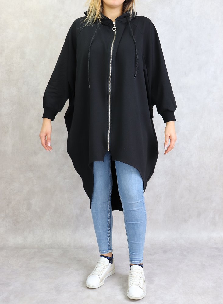 Veste longue, capuche avec lien, manches papillon, fermeture zip, matière sweat.