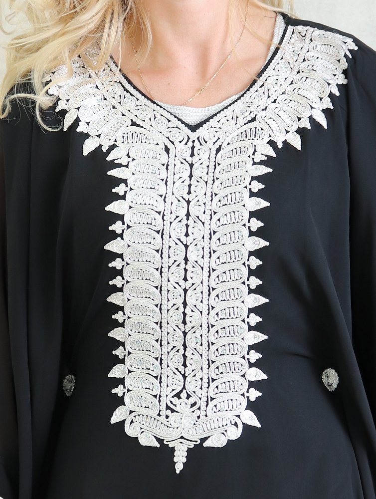 Robe orientale au top de l'élégance. Cette robe de soirée avec broderies et strass. Faisant partie de la culture maghrébine, elle est composée d'un dessus en mousseline et fournie avec sa sous robe longue sans manches (doublure satinée style soie). Elle dispose aussi d'une ceinture de l'intérieur si l'effet cintré est recherché.