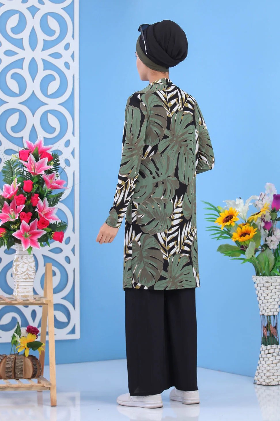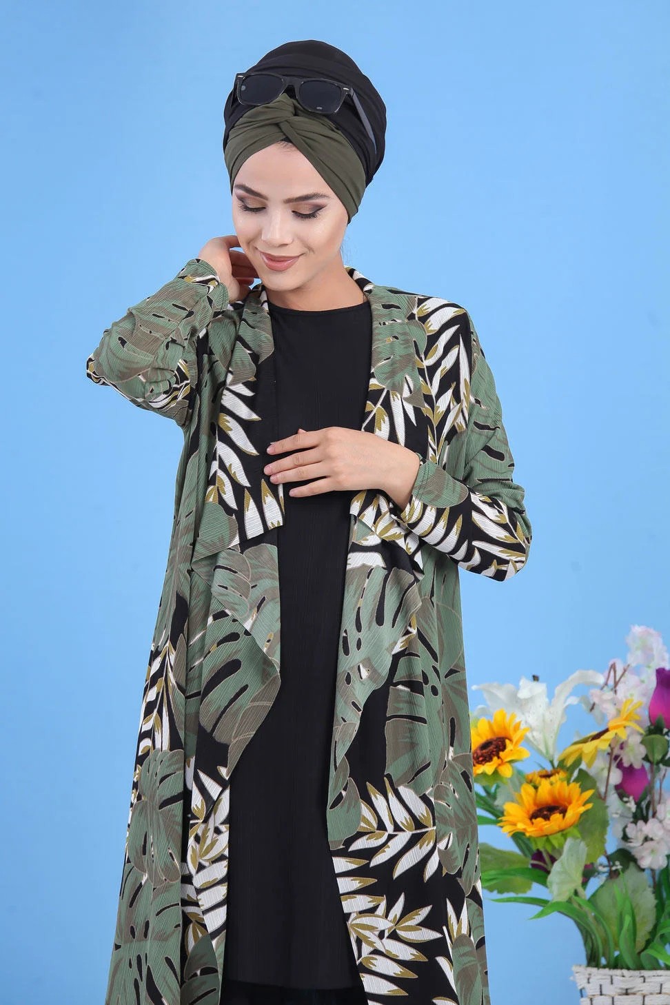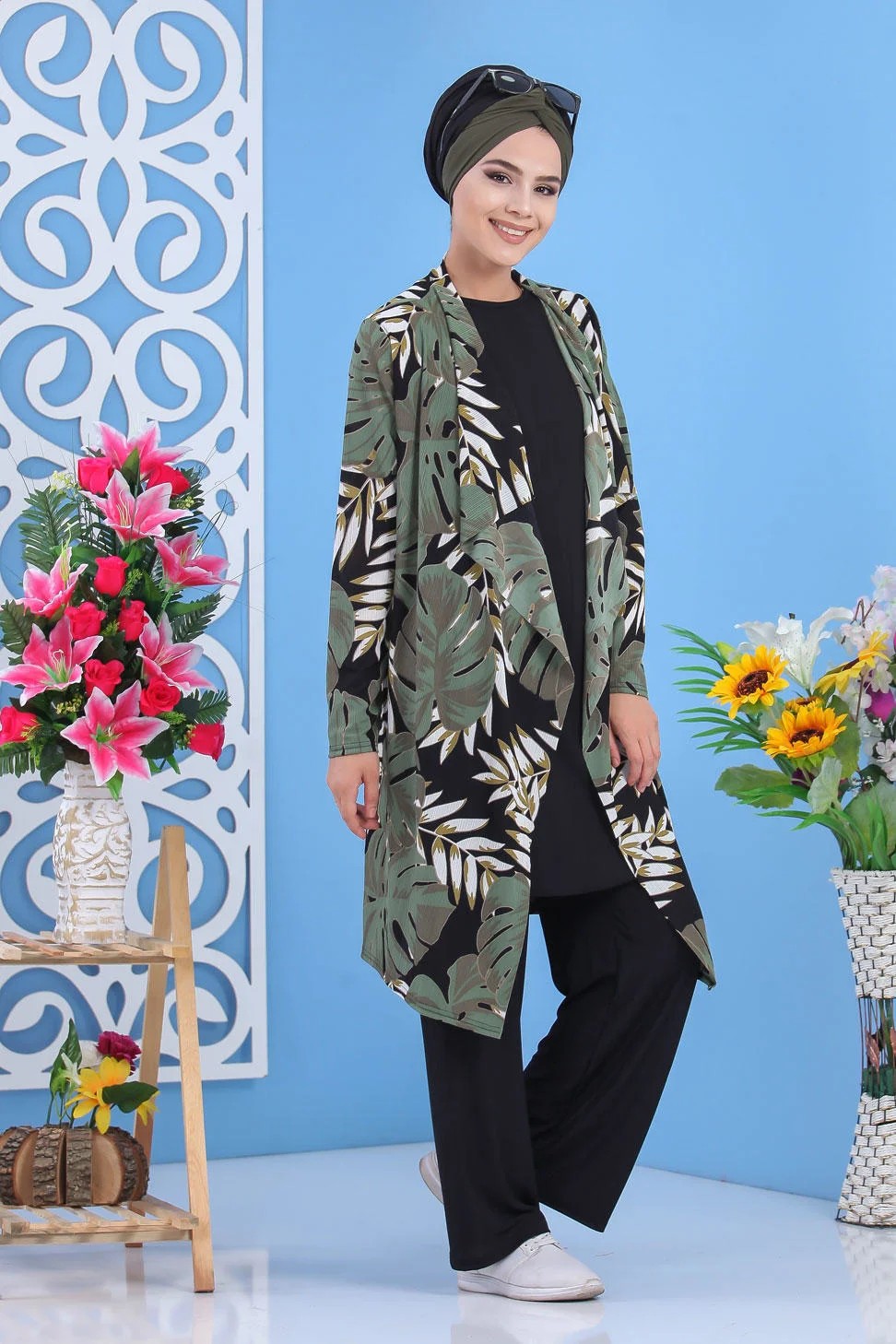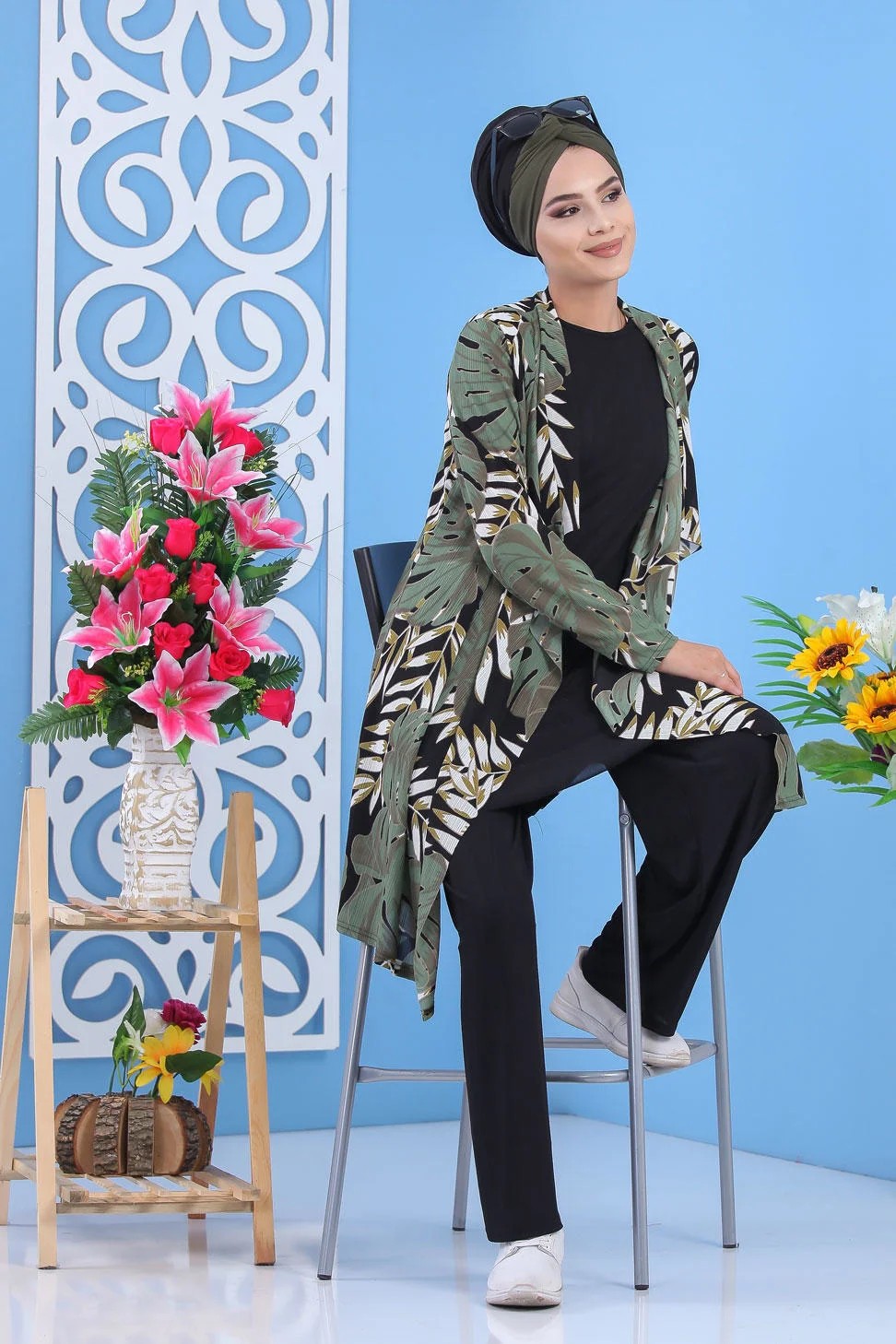 Ensemble trois pièces se composant d'un haut sans manches, col rond, d'un gilet long imprimé col châle, fluide et élégant, et d'un pantalon, taille élastique. Cet ensemble tendance vous permettra d'avoir un look parfait.