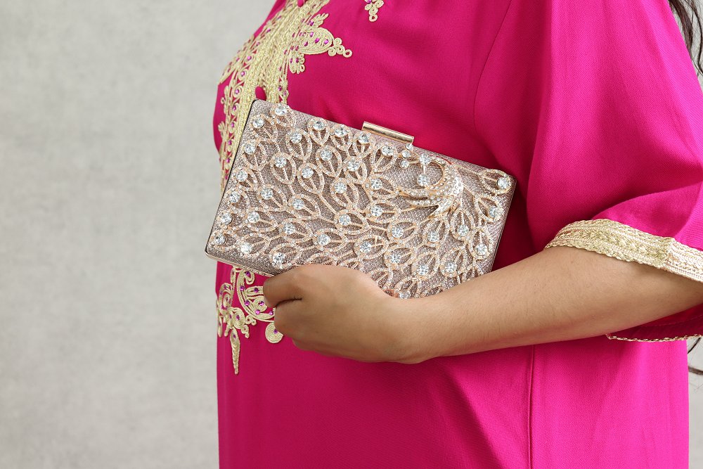 Une pochette cérémonie pour femme toute dorée et décorée perles blanches.