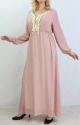 Robe de soirée, col rond, glissière au dos, manches bouffantes finition bande strass sur les poignets, taille légèrement cintrée. Coupe droite, tissu mélange mousseline et strass, entièrement doublée.