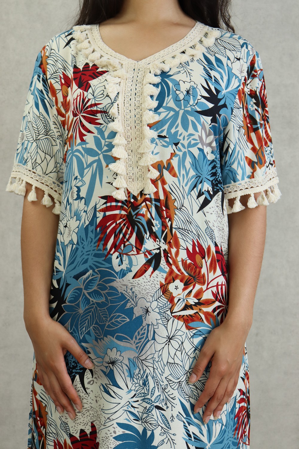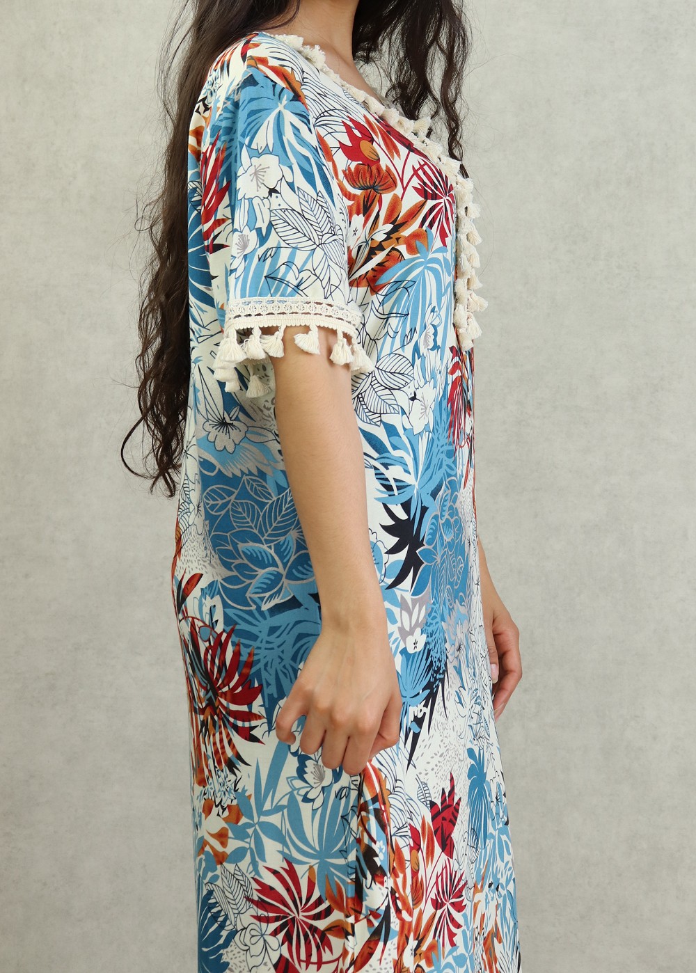 Robe longue d'été ou pour la maison à imprimé exotique pour femme, manches courtes avec broderies et pompons beige, coupe droite, tissu fluide et doux au toucher coton.