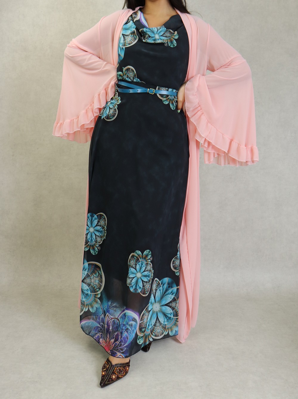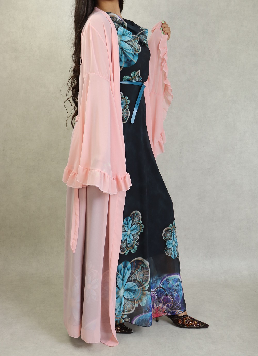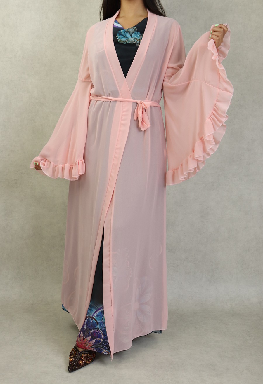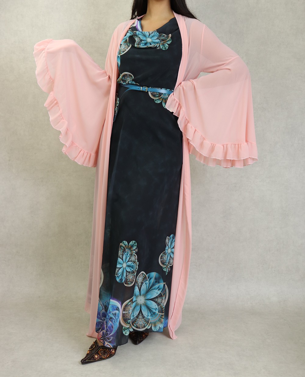 Kimono style bohème long, avec manches cloches et évasées, le tout accompagné d'une ceinture. Très joli à porter sur une robe.