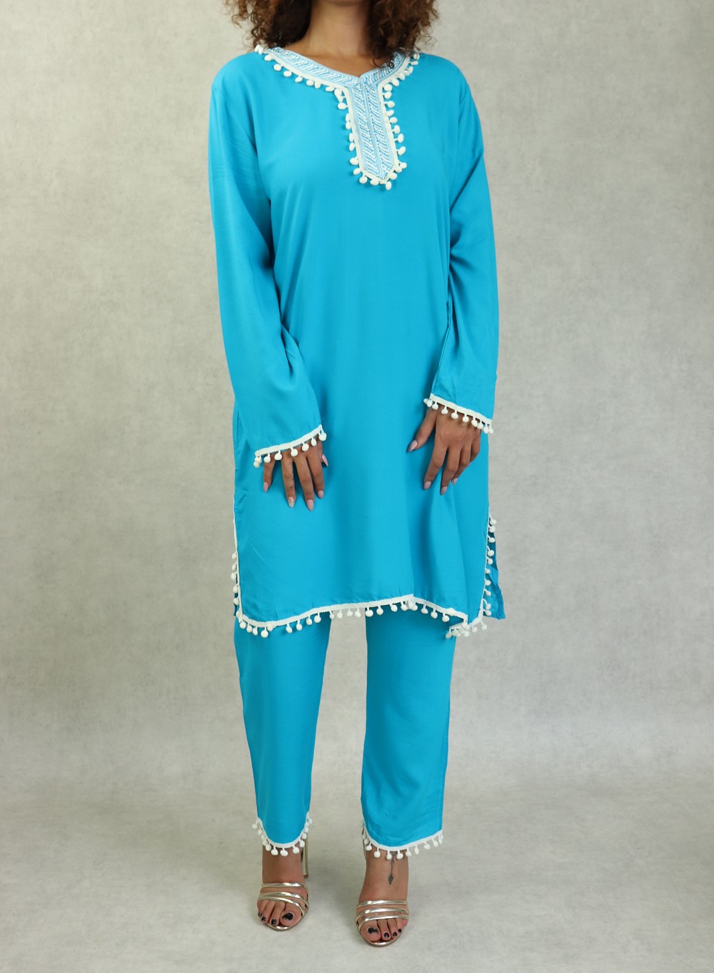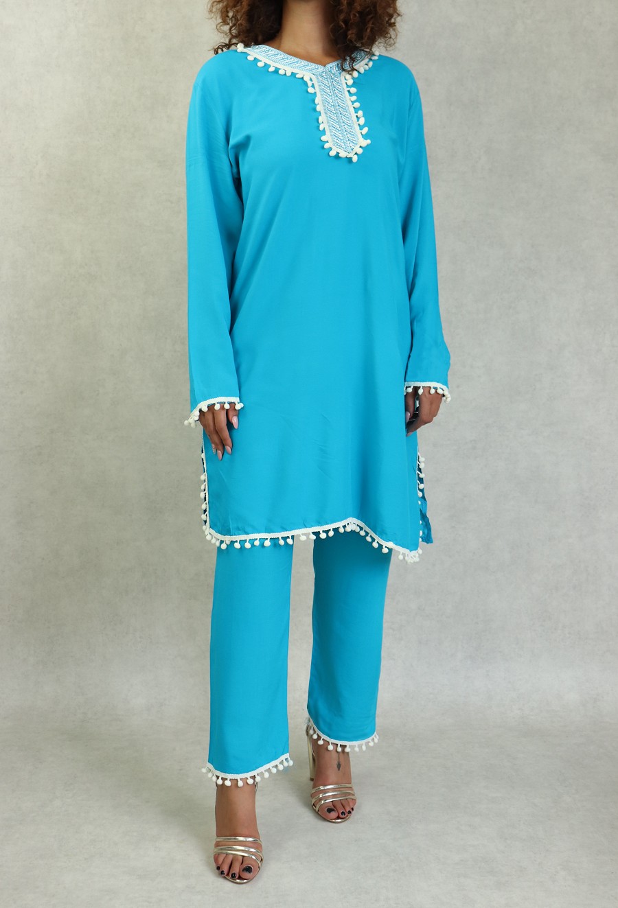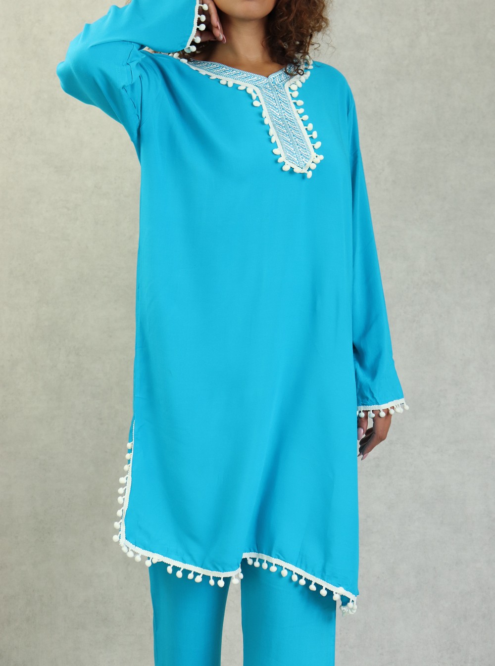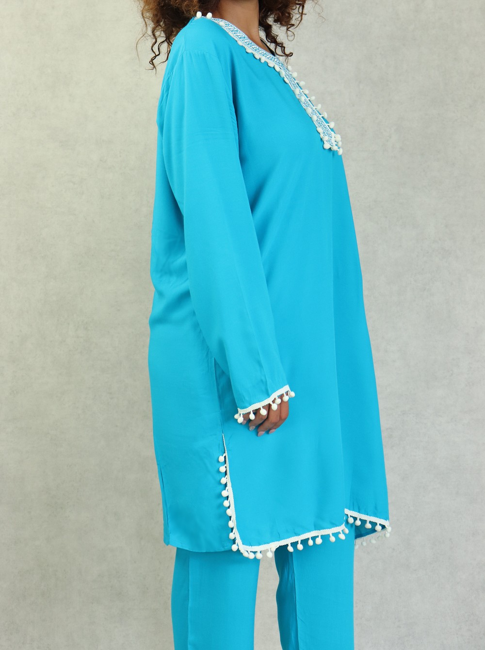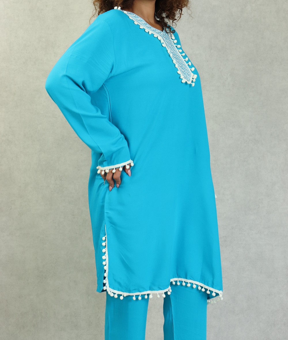 Ensemble style Jabador femme composé d’une tunique avec broderie assortie à de petits pompons sur le buste et sur la fin des manches, Col en V, et son pantalon assorti avec ceinture élastique, deux poches latérales, coupe droite.