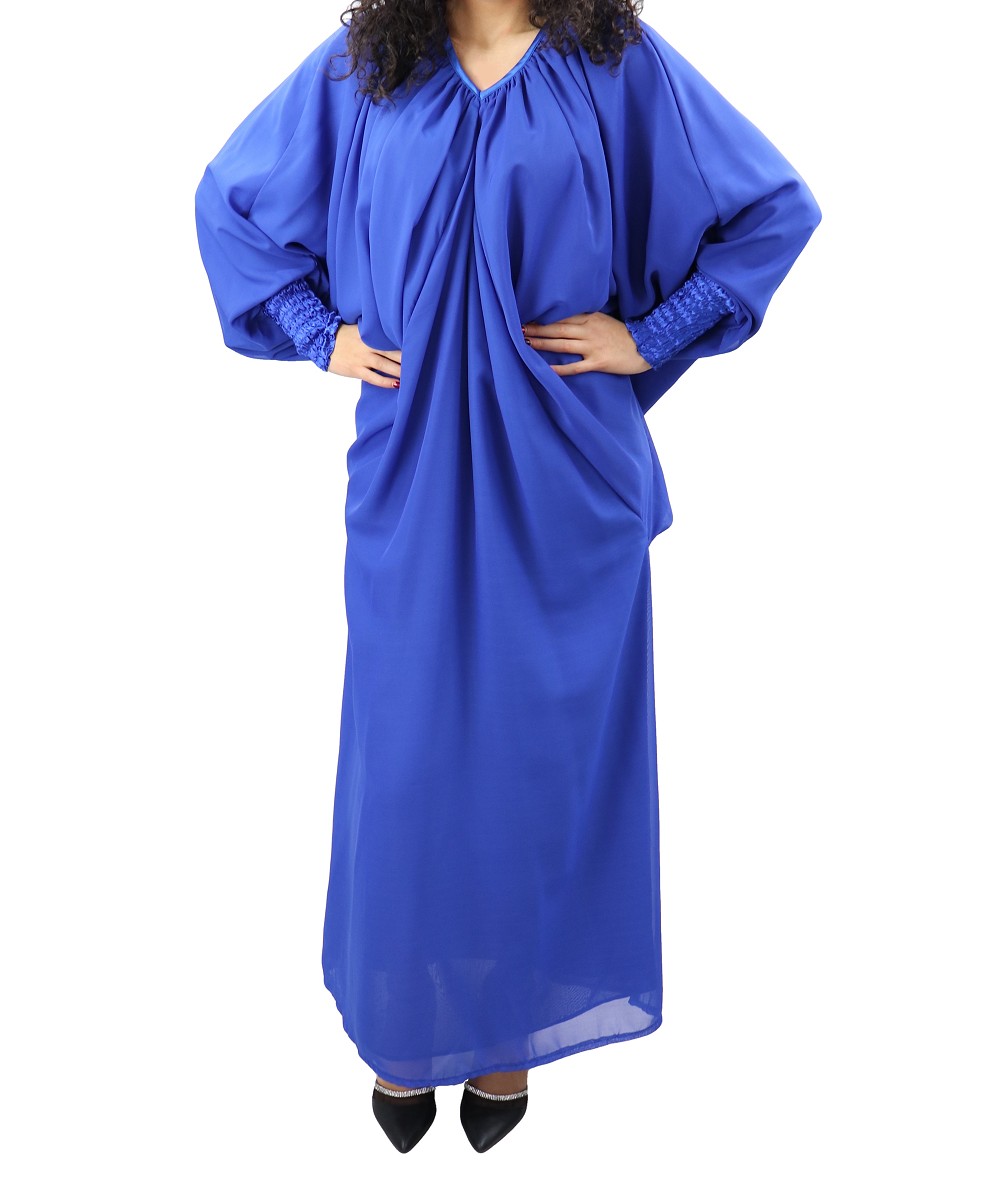 Robe confortable et habillée . Col en V satiné, manches amples resserrées aux poignets par une bande élastique froncée et satinée. Tissu léger style "organza" accompagné d'une doublure. Coupe papillon en haut et droite au niveau des hanches.