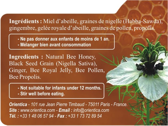 Ingrédients : Miel de montagne, graine de nigelle (habba sawda), gingembre, gelée royale, graine de pollen d'abeille, propolis.