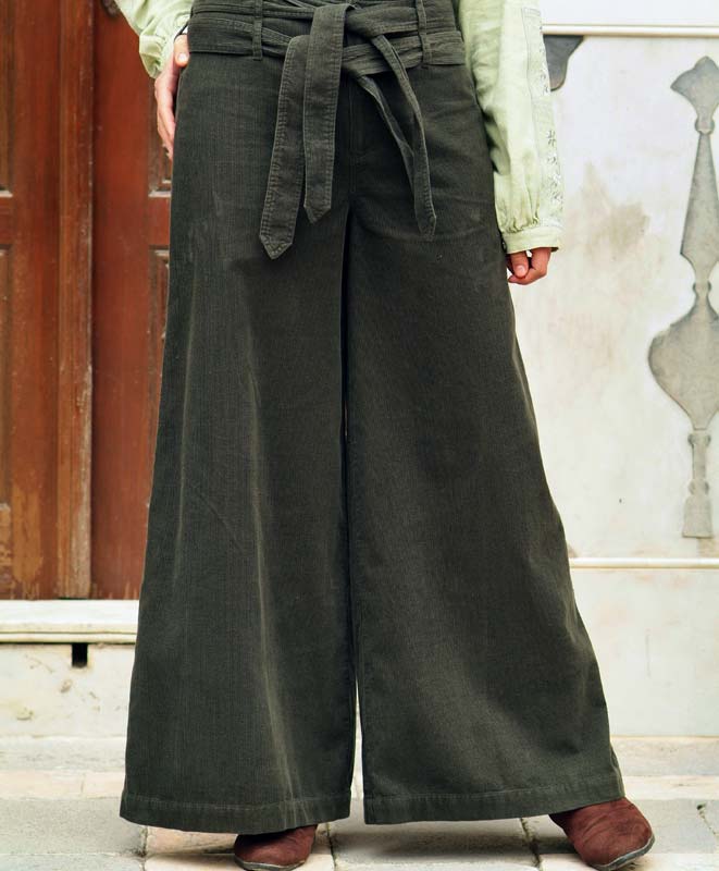 Any modern Muslimah would love these flared fine-wale corduroy pants. Double belts add style to this comfortable and versatile garment.