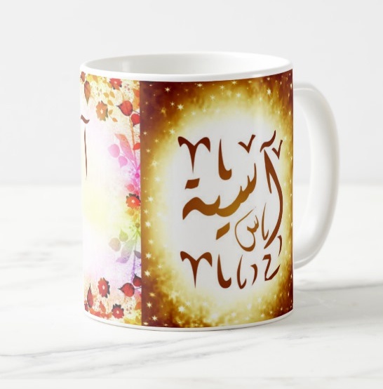 Mug avec le prénom "Assiya" écrit en français, en arabe (آسية) et calligraphié de façon artistique en arabe sur la partie droite.