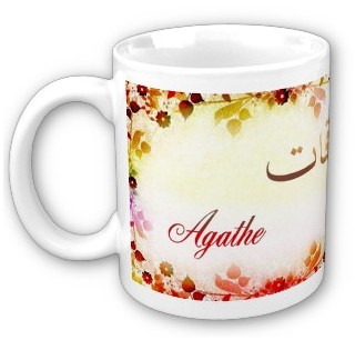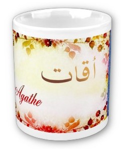 Mug avec le prénom "Agathe" calligraphié en arabe (أقات) ainsi que son épellation lettre par lettre en arabe.