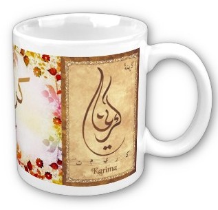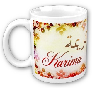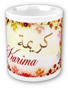 Mug avec le prénom Karima calligraphié en arabe (كريمة) ainsi que son épellation lettre par lettre en arabe.